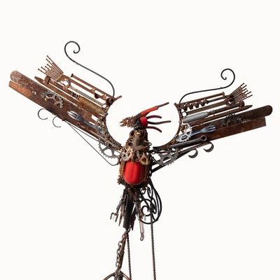 Kost's journey to becoming a scrap metal artist began when joined the Navy at 17 years old and became a hull technician, eventually joining a battalion with the Navy Seabees as a steelworker. During a deployment overseas, he experienced trauma and when he got home, Kost said he tried to put his traumatic experiences aside and move forward. He became an ironworker in Chicago and after seeking mental health counseling through the Veterans Health Administration, he began to tinker with spare metal parts to create animal sculptures. As mentioned above, he dismantled typewriters and sewing machines in his basement to occupy his mind and hands and through this, he started creating his first projects, small simple bolted and riveted figures. Since delving into scrap metal art, Kost has become a voice for the challenges combat veterans face, advocating for them to use their time and energy constructively. He's also a musical artist; Kost plays drums for the rock band The Seventh Sons. He has proudly displayed his sculptures at the Illinois State Museum, The Library of Congress, The Joliet Historical Society, The National Veterans Creative Arts Festival, Scrapfest Metal Art Festival in Lansing, Michigan, and online as a featured Veteran Artist with a special commissioned sculpture prominently displayed on the Google search page and installed in their HQ at St. Johns Terminal in New York City. In October of 2018, he had his first experience sharing his art in public at a Chicago Veterans art show and he felt a sense of belonging with the talented veteran artists he met there. Since then, he has found a deep sense of purpose in sharing his journey and inspiring other veterans to find the healing power of art for themselves. As he continues to take the next steps in his journey, he looks forward to finding opportunities to create and share more public art installations. To learn more about him, visit his website at: http://www.stevekost.com/